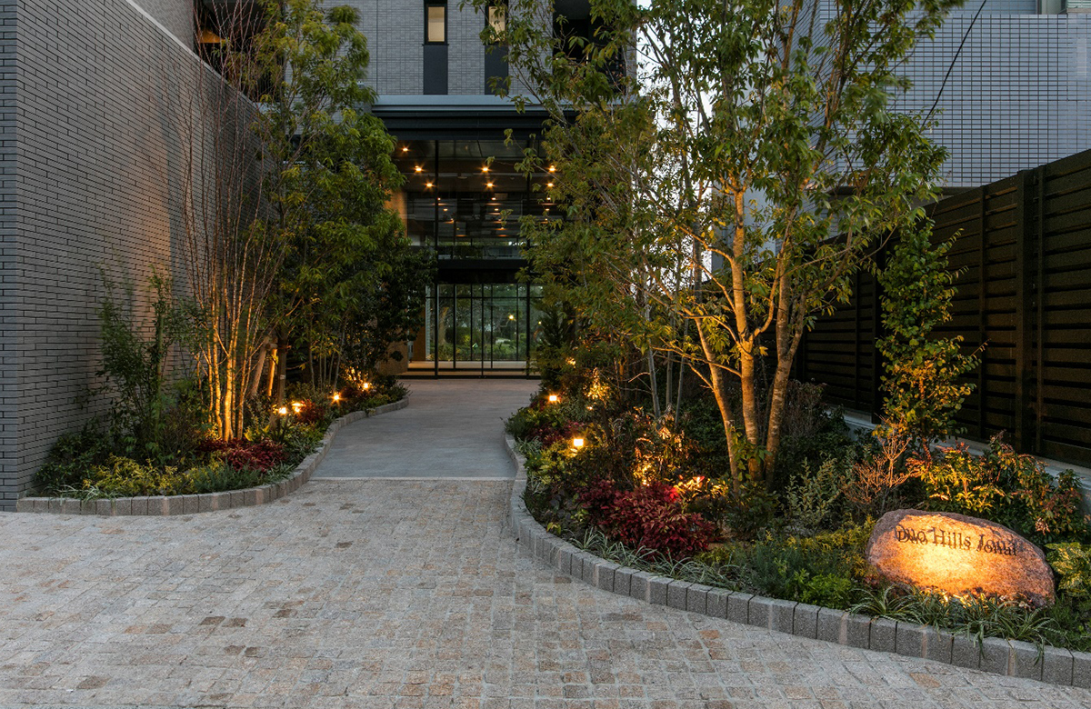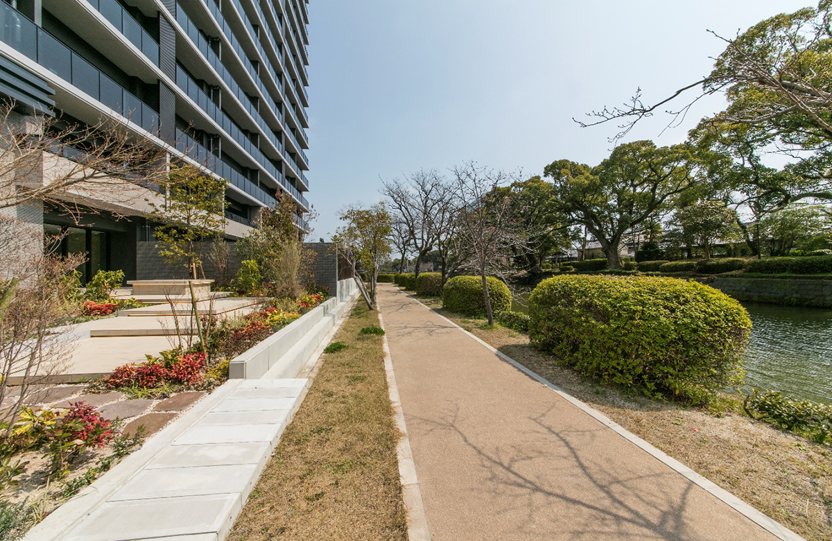 お濠沿いには散策路があり、市民の憩いの場として親しまれています。元々は雑木林のように緑が鬱蒼とした様子でしたが、本物件の計画が始まったころに行政による整備が始まり、マンションが完成する頃にはキレイな散策路ができました。この散策路にすぐ出られるよう、ラウンジから緑道に向かって緩やかに下っていくステップのある、「ビューテラス」を設けました。これは敷地と緑道の境にある、側溝に通行用の蓋をかけるための施設設置許可を申請することで実現したものです。滞在する場というよりも、ここを通って外に出かけたくなるような空間作りを行いました。