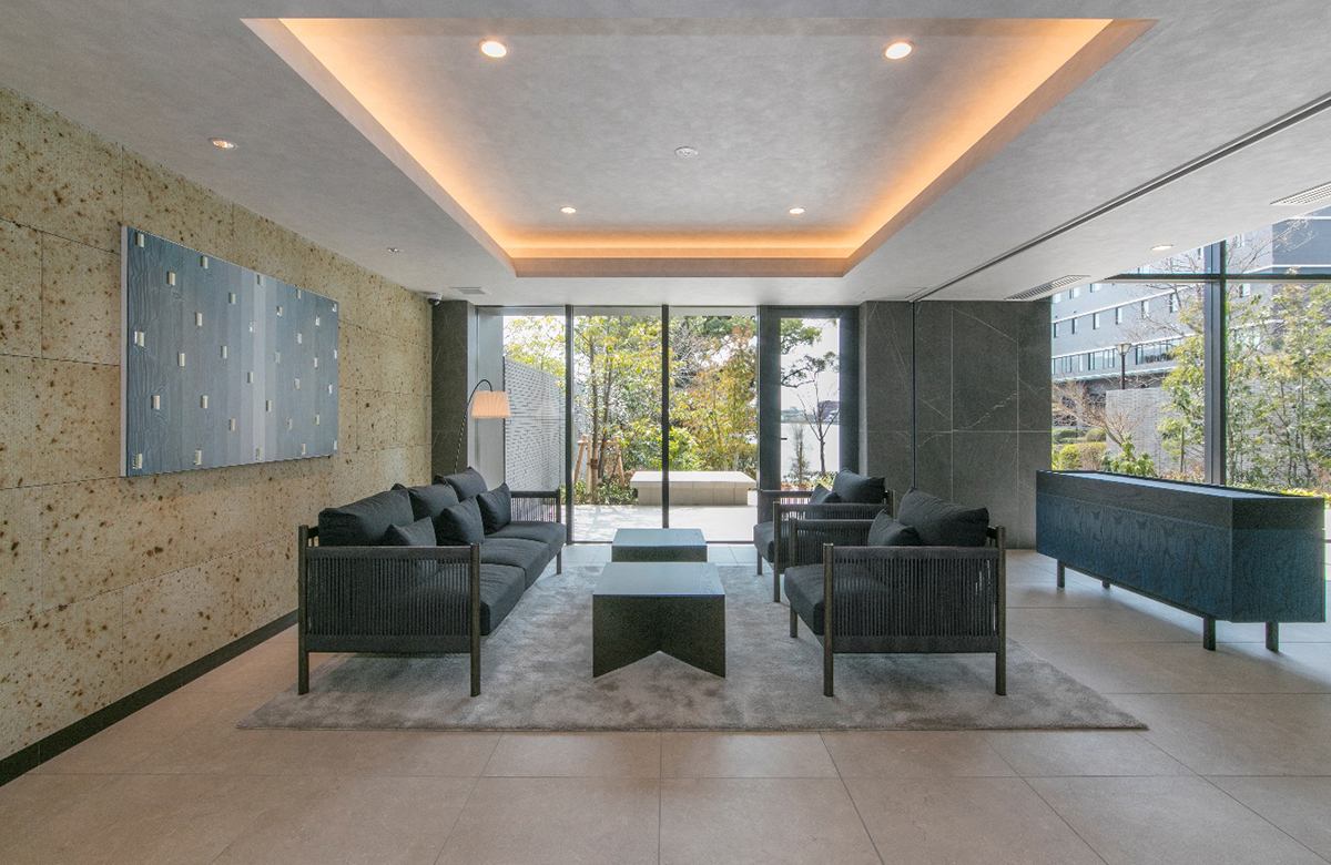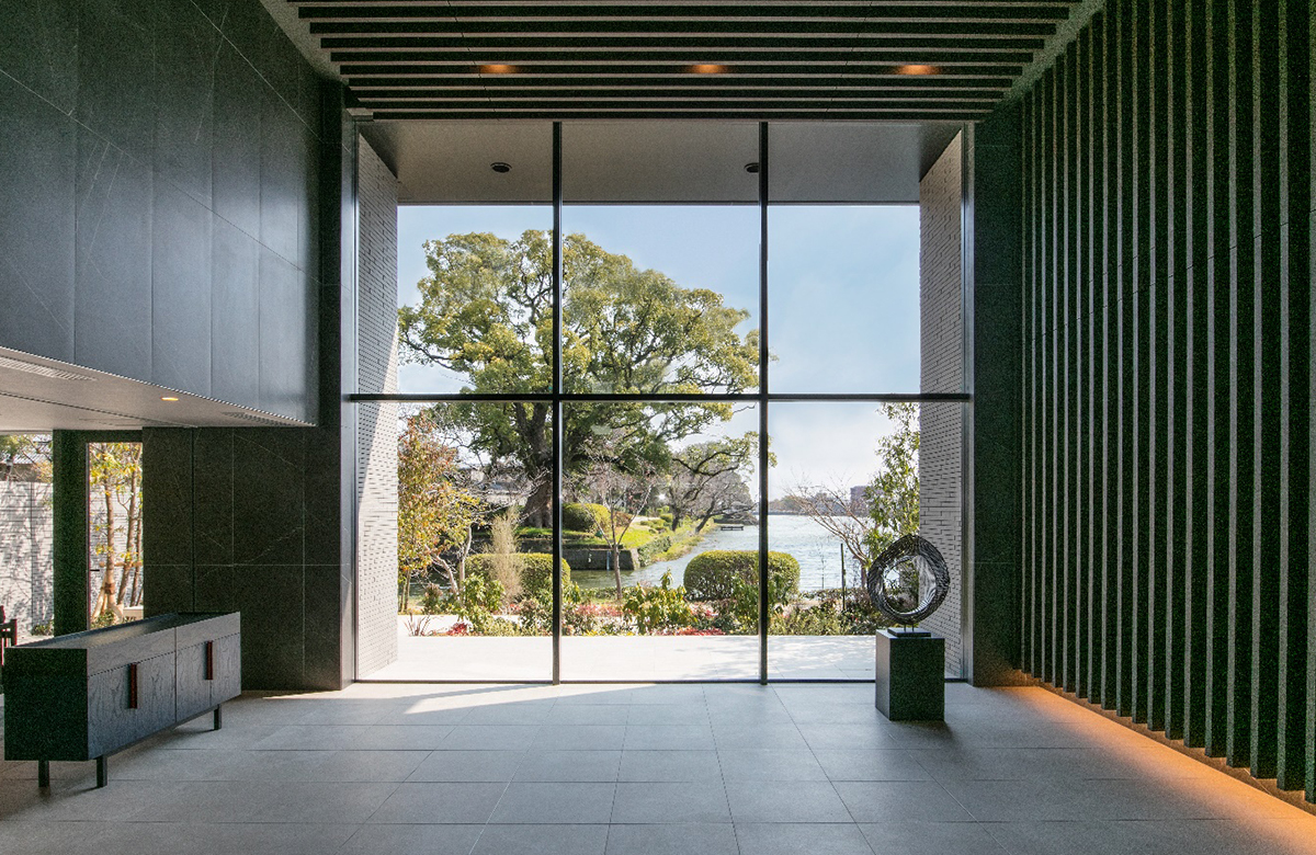 建物内も外の景観が主役です。本物件が建つ前は、建物がお濠に背を向ける形で道路向きに並んでいました。せっかくの景色に背を向けてしまうのは勿体ないと思い、お濠側の価値ある景色を道路側からも見えるよう、アプローチからエントランス、ラウンジ、お濠が一直線になるような配置にしています。