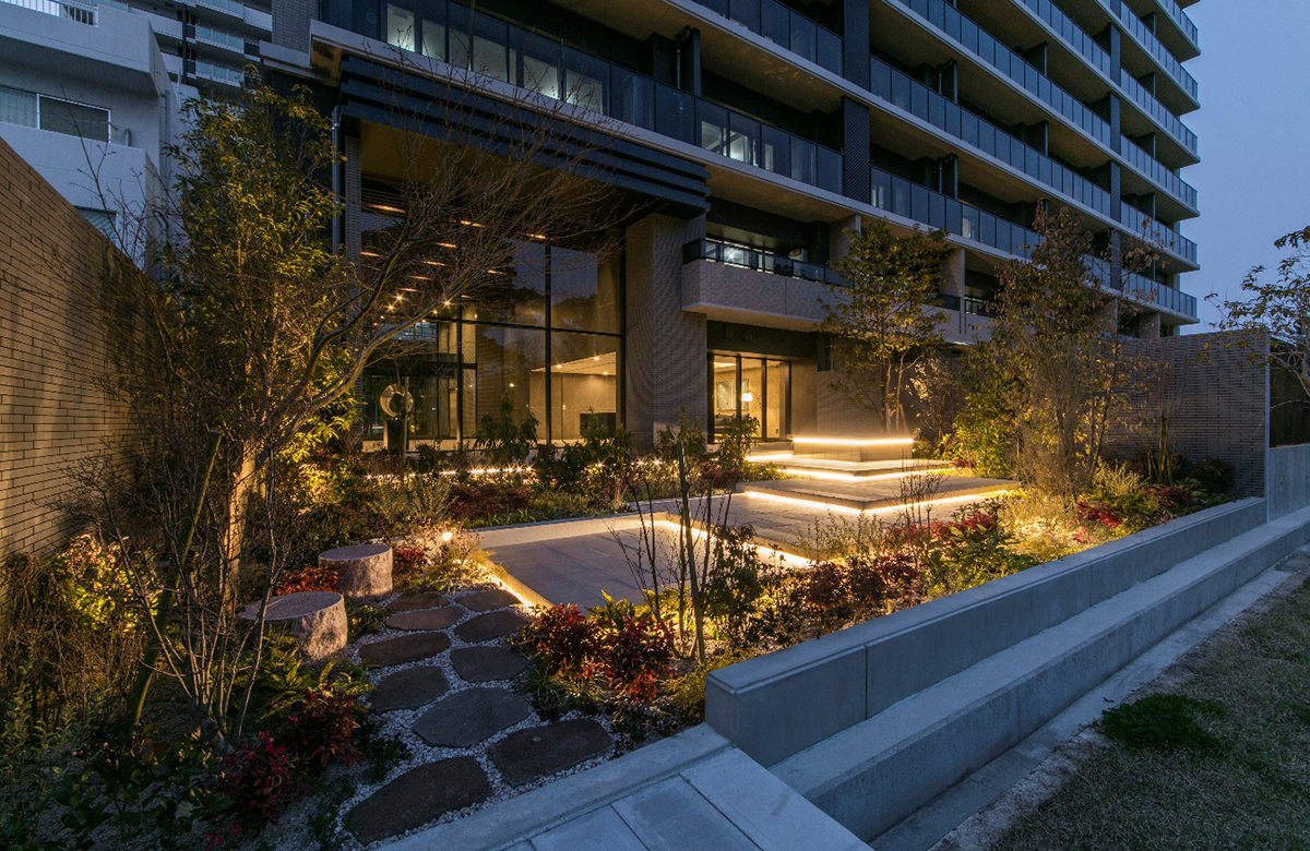 緑豊かなお濠の雰囲気に合わせて、テラスにも植栽をふんだんに植えています。夜は暗い印象を受けるお濠を彩れるように、ステップの間に間接照明を入れました。夜周りが暗い中でステップの灯がキレイに光り、良い雰囲気を作ることができたと感じています。