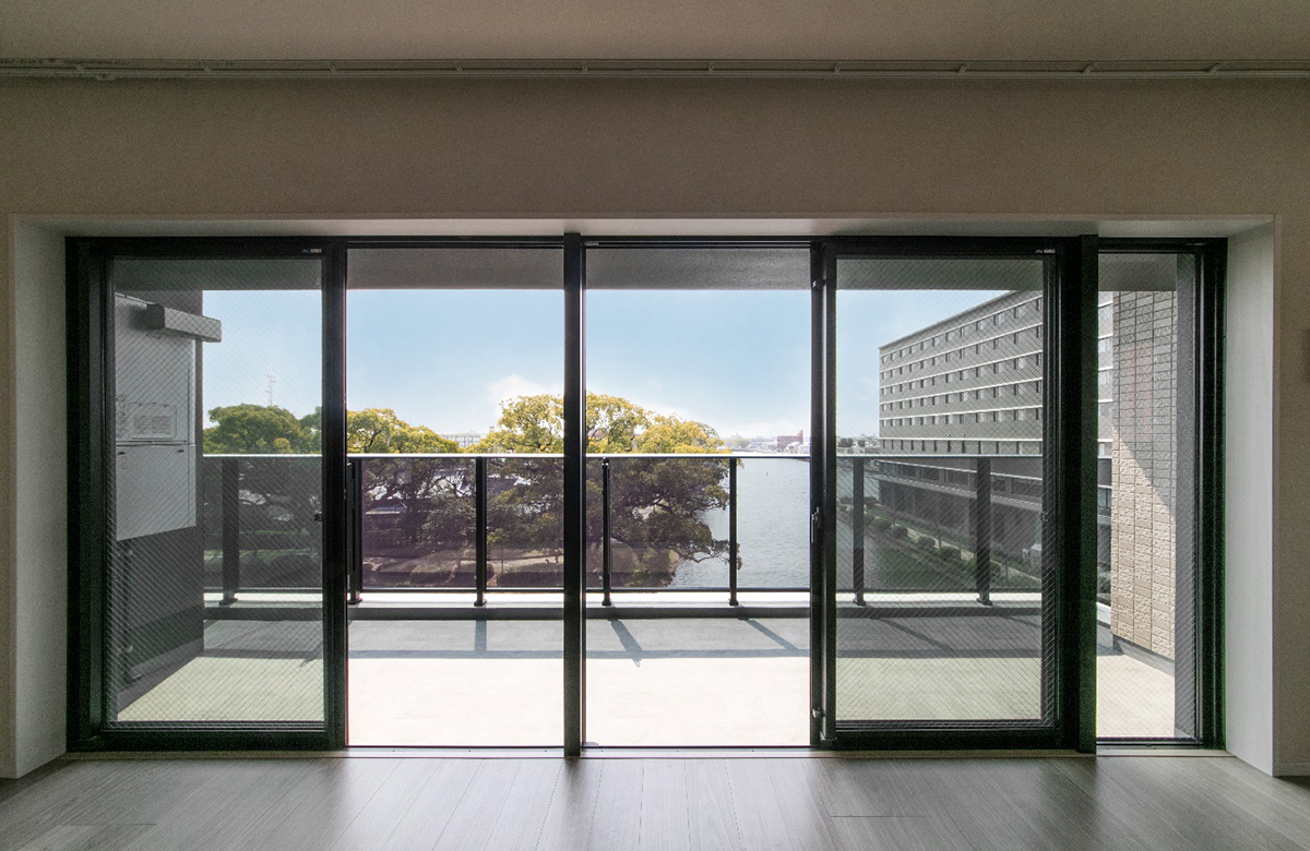 各居室も外とのつながりを意識して、ワイドリビングを基本とし、開放感のあるサッシや立ち上がりのないキッチンを採用して、開放感を持たせています。最上階はウッドデッキを敷いたルーフバルコニーを計画しているタイプもあり、リビングダイニングとバルコニーの床面の高さを一緒にして、中と一体として使えるようにしました。どの部屋のバルコニーからもお濠が見え、上階からは佐賀城内が一望できます。下の階は目の前に緑と水面が広がっていて、個人的にもとても好きな景色です。お濠は春の桜や秋の紅葉など四季によっても見える景色が変わってきます。お堀に映える夏の青々とした緑はお客様から好評いただきました。