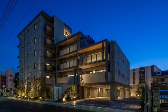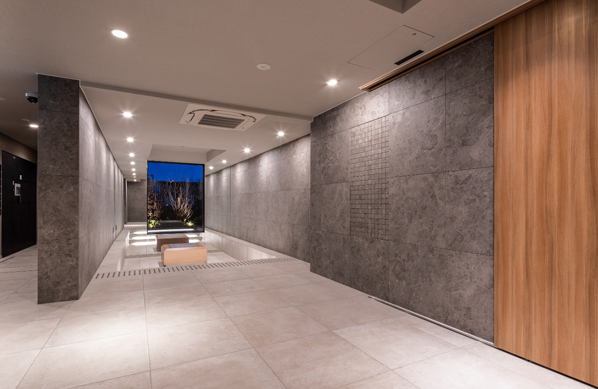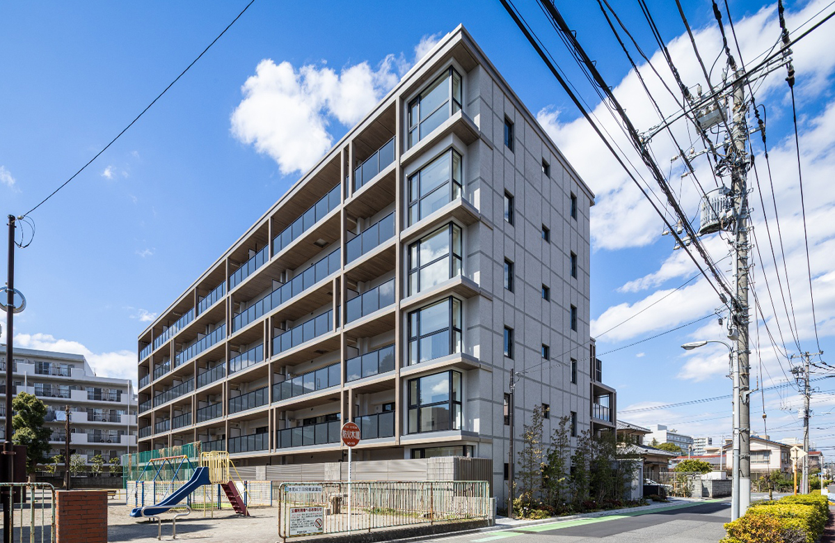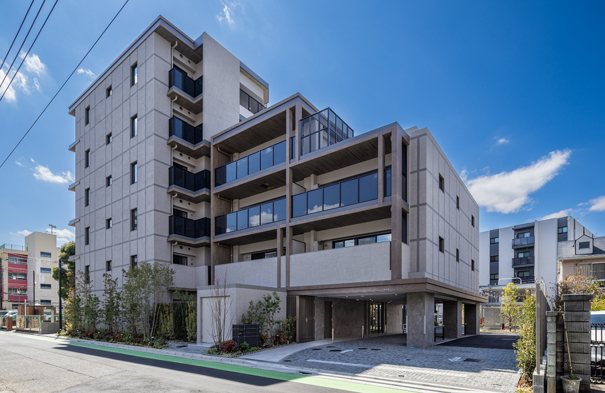 外観は、駅近で都内にも近いこの立地を選ぶ方々にご納得いただけるよう、都会的で高級感のあるデザインを目指しました。全体的に落ち着いたテイストにしつつ、周辺に埋もれない工夫も施しています。目の前や周辺に公園が多いことから自然との調和も意識し、軒裏やマリオン※など目立つ箇所には木目調の塗装を採用しました。側面はセラミック調の装飾仕上塗材で格子状の目地を設けることで、一味違った印象を与えています。バルコニー側も単調なデザインにならないよう、マリオンをランダムに配置しました。