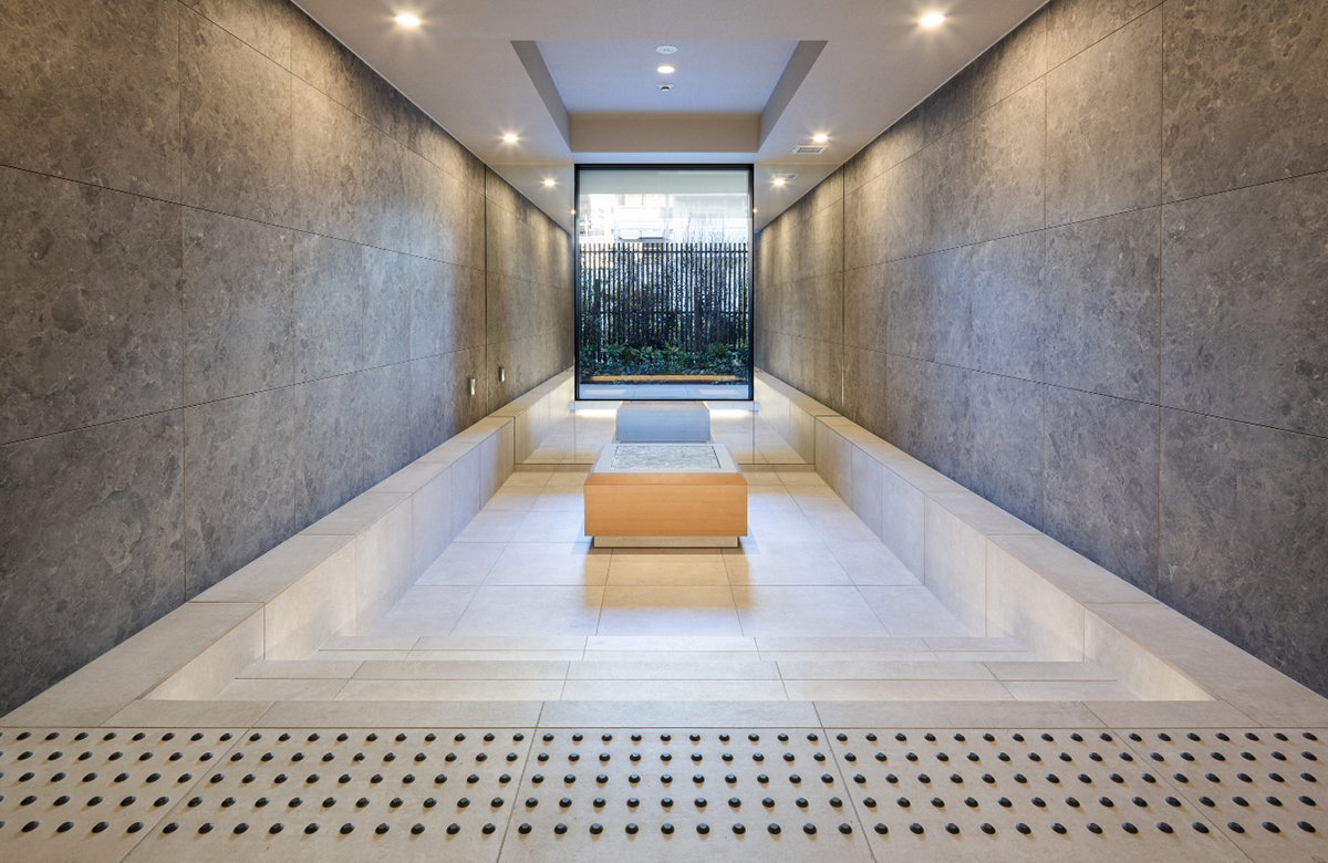 防災対策に加え、本物件は福祉の面での配慮も求められました。戸田市は福祉にも力を入れており、「戸田市バリアフリー基本構想」と「埼玉県福祉のまちづくり条例」の2つの規制が関わります。例えば、各階の階段の踊り場やラウンジの段差の手前には点字タイルを設けなければなりませんでした。必要な機能を満たしつつ、周囲のデザイン性を損なわないようなモノづくりを心掛けました。