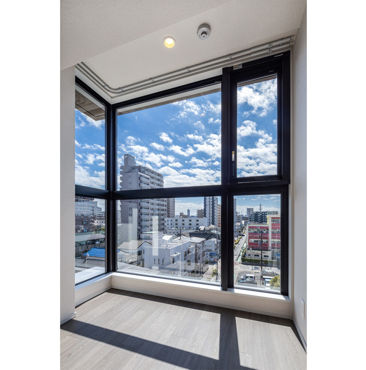 角住戸には、大きな窓が特徴の「Re: Room(リ・ルーム)」を採用しています。「Re: Room」は、バルコニーでもなくサンルームでもない、室内でありながら半分室外という中間領域で「Refresh・Relax・Reset」の3つの“Re”ができる空間です。天井から足元までガラス張りなので、外からの光と風が気持ちよく、在宅ワークをしたりお茶を飲んだり心地良い時間を過ごすことができます。また、この大きな窓は外観のアクセントにもなっています。