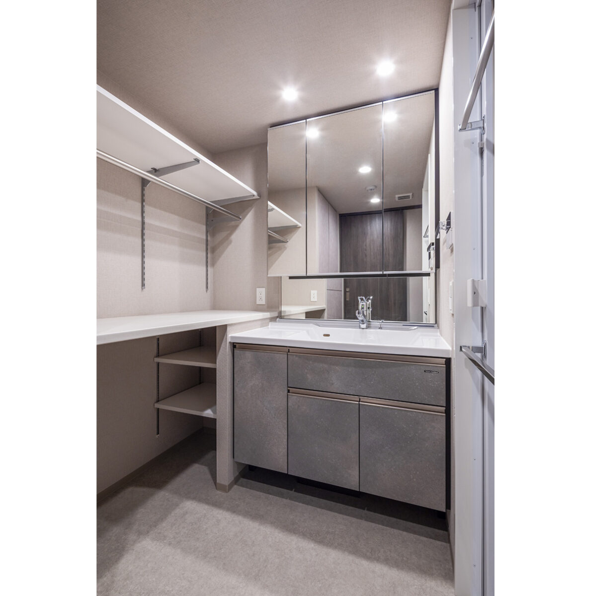 洗濯に関する悩みを解決するために生まれた「Arau(アラウ)ラック」を導入した住戸もあります。Arauラックは、洗面にカウンターとハンガーパイプを併設することで、「干す」「畳む」の作業を楽に効率的に行える商品です。