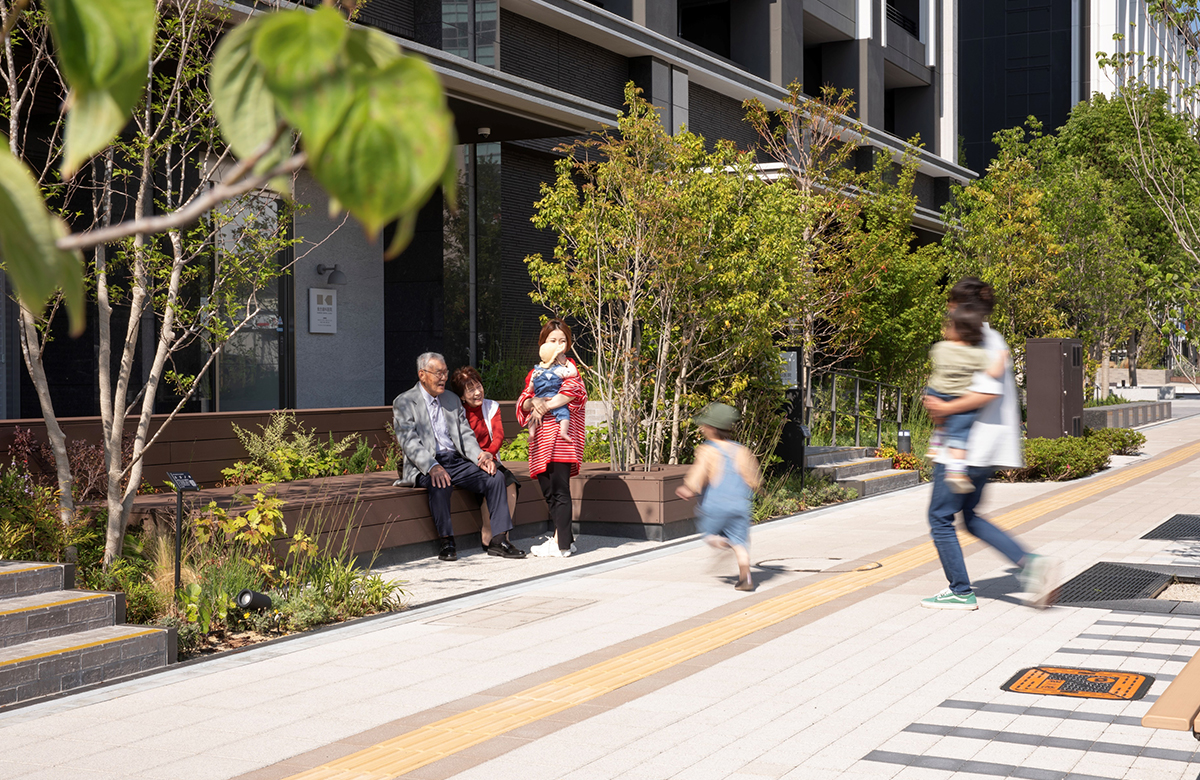 マンションのエントランス前に設けた「並木広場」は、日常的には街の人々の休憩や子どもの遊び場として、イベント時には前面道路と一体的に活用し、マルシェやファーマーズマーケットの会場となるなど、日常にもハレの日のどちらにも対応できる柔軟な空間です。