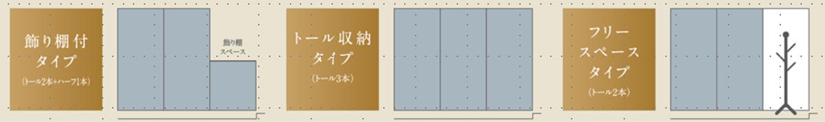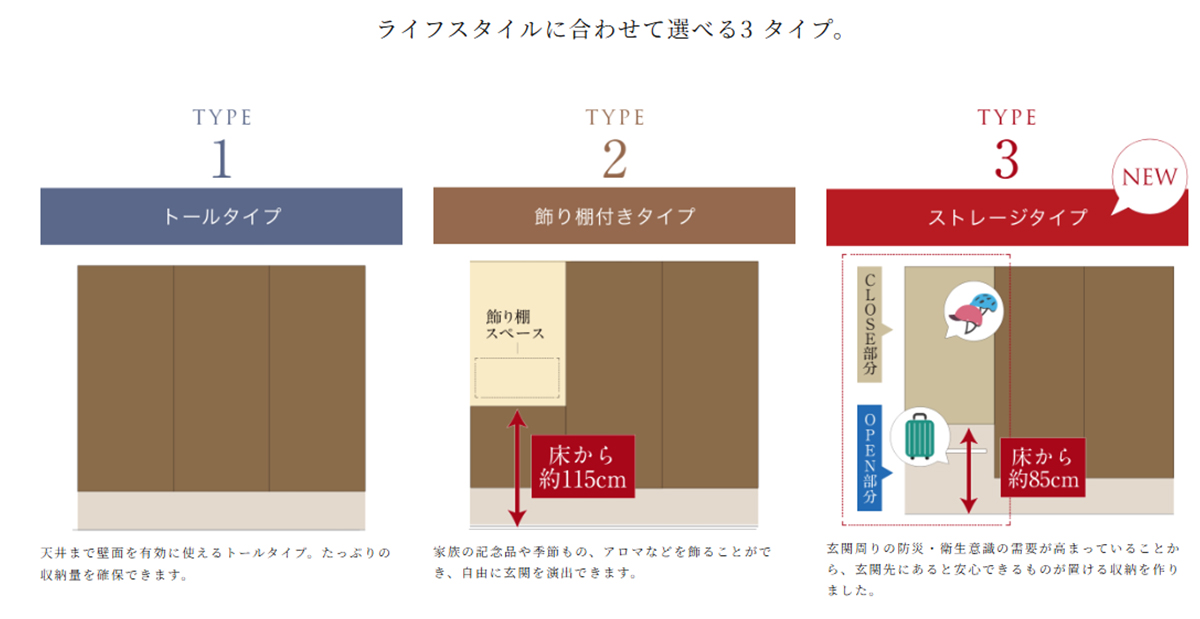 私たちはこれまで、玄関収納として3つのタイプをご用意してきました。天井まで壁面を有効に使い、たっぷり収納できる「トールタイプ」、一つを低くして飾り棚にした「飾り棚付タイプ」、収納を一つ無くしてコートハンガーなど背の高いものを置けるようにした「フリースペースタイプ」です。