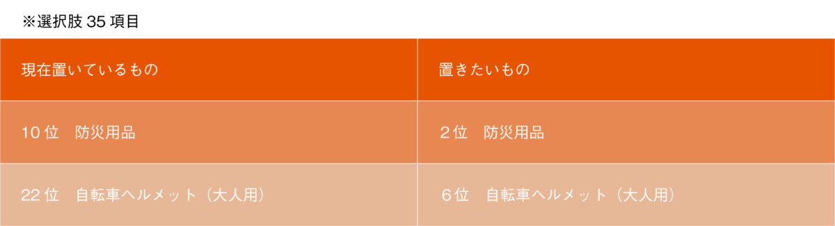 一方で浮かび上がってきたのは、暮らしの価値観そのものの変化です。コロナや震災など自然災害を経て、防災や衛生の意識が高まっており、玄関に「置いておきたいもの」「すぐに取り出したいもの」は、以前とは変わってきています。「玄関に靴や傘以外で置いているもの・置きたいもの」を伺ったアンケートでは、マスク、除菌スプレー、除菌シートなど、衛生用品が多く挙がりました。現在置いてはいないものの、今後置きたいものとしては、防災用品がランキング上位という結果になっています。さらに、2022年の道路交通法改正により、自転車利用時のヘルメット着用が努力義務化されたことで、家族分のヘルメット置き場を求める声も増えました。