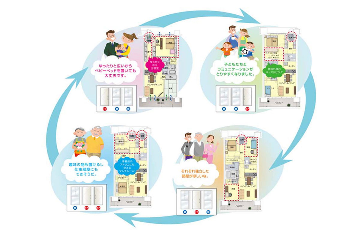 従来の集合住宅では、ライフスタイルが変化する時期に間取りや部屋の広さに住まいづらさを感じ、転居を余儀なくされる傾向が見受けられます。その問題を解決するために次世代まで住み続けられる住宅、共に成長する住まいの仕組みとして「どちらもドア」を考案しました。玄関扉や居室の窓といった共用部の変更を可能とすることで、住まう方々の変化に応じた自由な間取りの実現をめざしました。