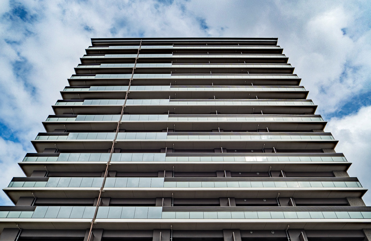 建物は角地の立地を生かし、街の起点となるランドマークを意識したデザインとしています。最上階には大きな庇を設け、木目調のルーバーで温かみを出しながら、華やかで特徴的なデザインにしました。各階のスラブ※の形状を斜めにカットすることで、水平ラインを強調しながら、エッジの効いた印象を生み出しています。この斜めのスラブには、寒冷地ならではの配慮もあります。バルコニー面の下には、一般の方も立ち入ることができる公開空地があります。人が歩くことも想定されるため、雪が溜まりにくく落ちやすい形状を意識しました。バルコニーにはガラス手すりを採用し、部分的に木目調ルーバーを組み合わせています。ガラスには空を映し込む反射ガラスを用い、天候や時間帯によって異なる表情を見せるデザインとしました。