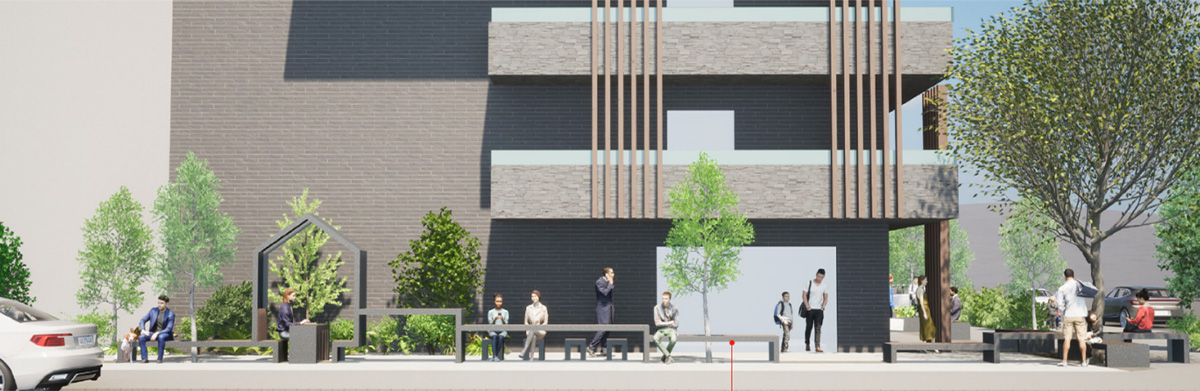 設計にあたっては、八戸市が行っている官民一体となって街路の将来的なあり方についての検討を行う勉強会「まちなかストリートデザインラボ」に参加させていただき、地域の方々と意見交換を重ねました。八戸市では道路の車線数などの実証実験も行っています。それに伴う住民アンケートでは「ベンチや休憩スペースが欲しい」「イベント時にキッチンカーが来るとうれしい」といった声もあり、それらを参考に公開空地のデザインを検討しました。