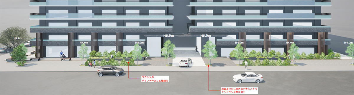 また、本プロジェクトは将来的にツインタワーとなる計画のため、2棟並んだ際の景観も重視しました。大庇やエントランスを反転させて配置することで、シンメトリーの美しい並びとなるよう設計しています。中央にエントランスを配置することで、ゆとりのある車寄せ空間も確保しました。