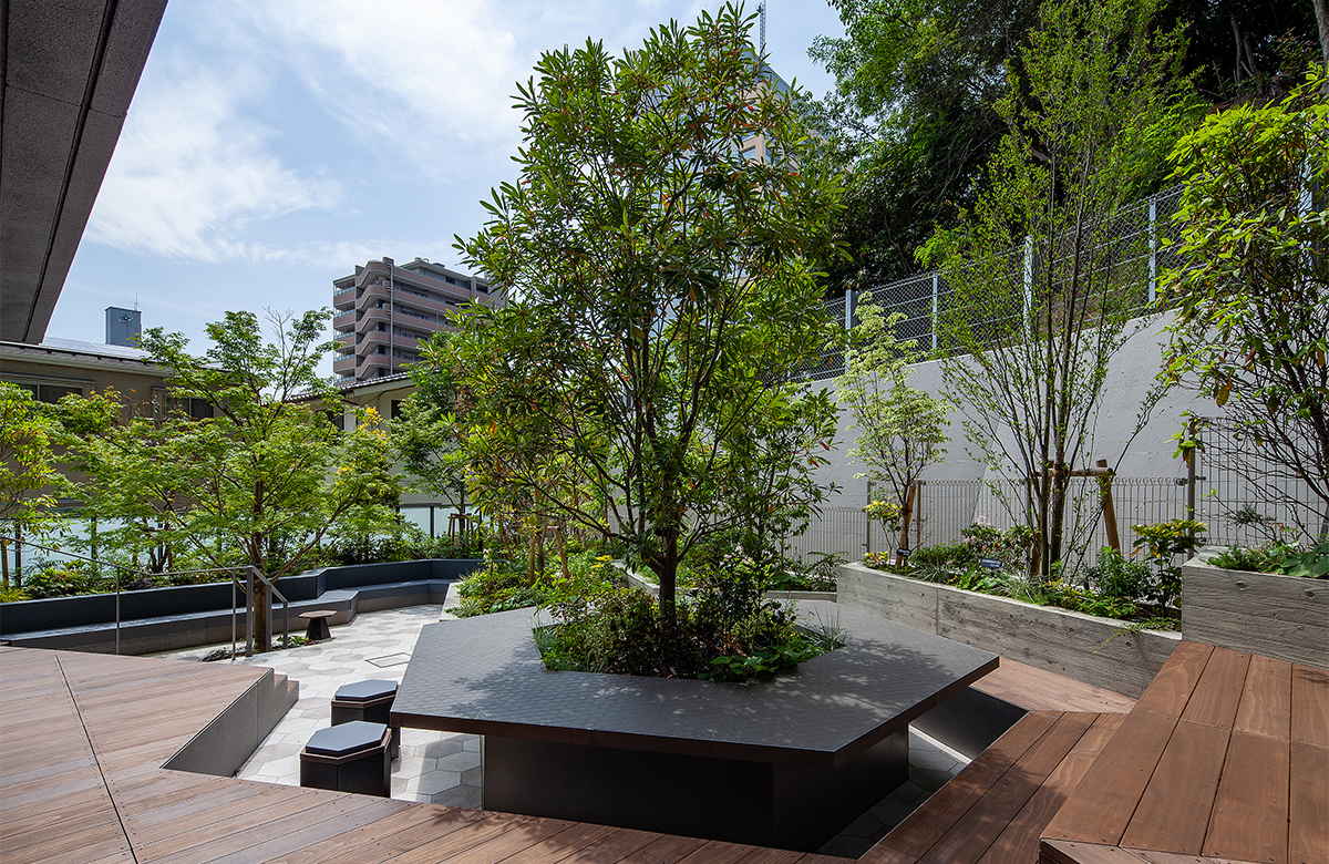 ここから比治山の四季折々の季節の変化を楽しむことができます。また、テラスにはいくつもの居場所があります。その時々の気持ちや風景に合わせて、自分の居場所を探すのも良いでしょう。山に囲まれた暮らしを実感できる場所となるでしょう。