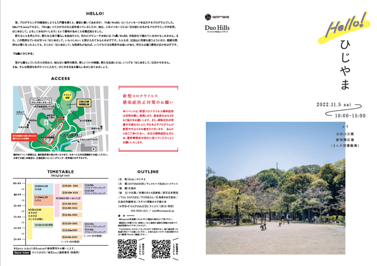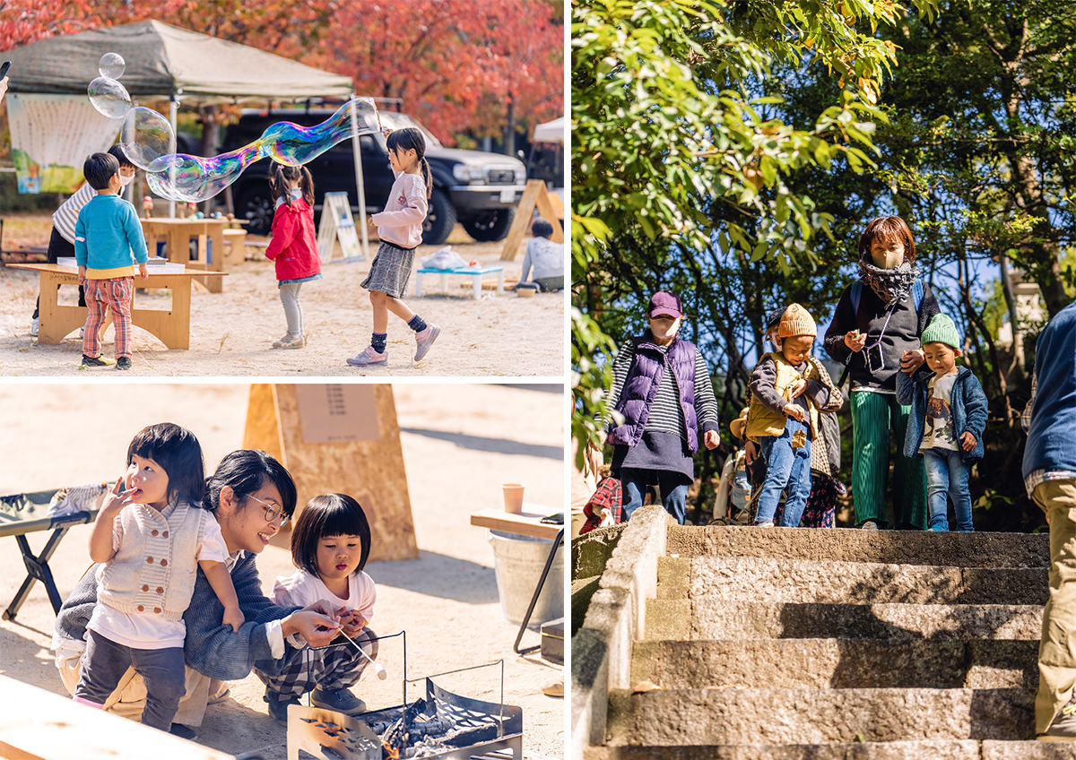 私たちは入居者にこの比治山公園の価値を知ってもらいたく、この地域で自然の恵を生かしてプレイパークやアート活動をしているSATOMACHIと共同イベントを行いました。多くの人に楽しんでもらうために朝から夕方まで、さまざまなワークショップを行いながら、公園のことやこの地域のことを知ってもらおうと考えたのです。下の写真はその時の様子です。子ども達が楽しそうに公園の中で遊んでいる様子が伺えます。